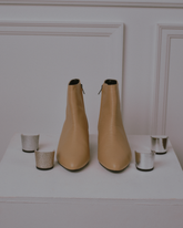 FAMZON共同開発のワンタッチで簡単にヒールを着せ替えできるショートブーツ。脱ぎ履きしやすいファスナー。足首と足先はゆったり仕様、でも足首が細く見えるシルエット。秋から春先まで履けるちょうどいい丈感。高品質で柔らかな天然皮革。滑りにくい靴底で、歩きやすい4cmヒール。